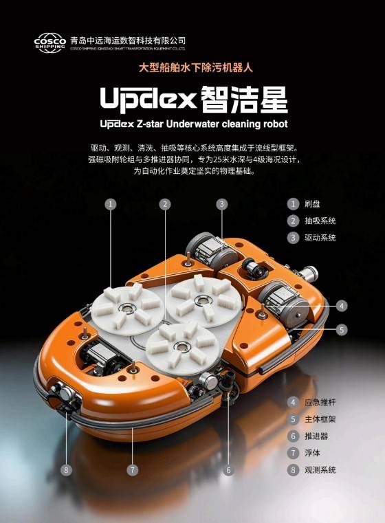 针对这一行业难题,由中近海运(青岛)无限公司全资子公司青岛中近海运数智科技无限公司自从研发的“Updex智洁星”,通过集成水下视觉识别、惯性、自顺应径规划算法,实现精准高效的智能化洁净,完全脱节了人工潜水功课的,大幅提拔船舶运维效率取平安程度,鞭策船舶除污从“人工功课”向“智能功课”、从“经验判断”向“数据驱动”的逾越式升级,为绿色航运供给了更智能、更可持续的处理方案。
